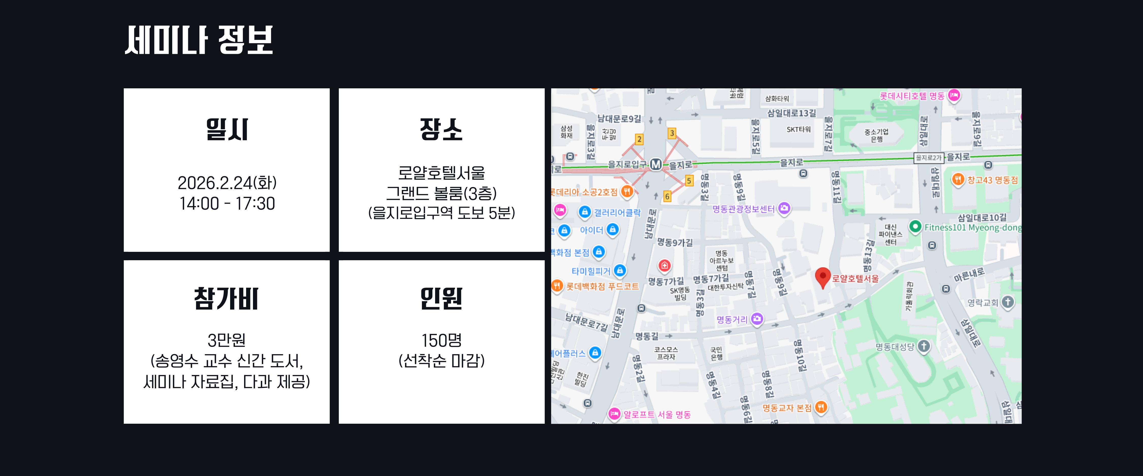 주차는 별도 지원되지 않습니다. 부득이하게 차량을 이용하실 경우에는 세미나 장소인 로얄호텔 및 인근 명동성당 주차장을 이용해 주시기 바라며, 가급적 대중교통을 이용해 주시길 부탁드립니다.